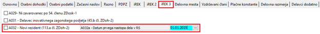 Dodan je nov zavihek iREK3, na katerem izpolnite polje A032 – Novi rezident (113.a čl. ZDoh-2) in A032a – Datum prvega nastopa dela v RS.