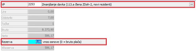Dodana je nova Vrsta plačila (VP) 2253 Zmanjšanje davka (113.a člena ZDoh-2, novi rezidenti). VP se v obračun doda in izračuna samodejno (v kolikor označite status A032 in vnesete ustrezne datume). V kolikor se z izračunano osnovo za davek ne strinjate, jo ročno vnesete v polje Rezerva: