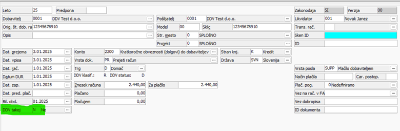 V polju 'DDV takoj' program privzeto vrednost polni z 'D' – Da (ker smatramo, da bo prejetih računov dobaviteljev – zavezancev za obračun DDV po plačani realizaciji bistveno manjši delež).